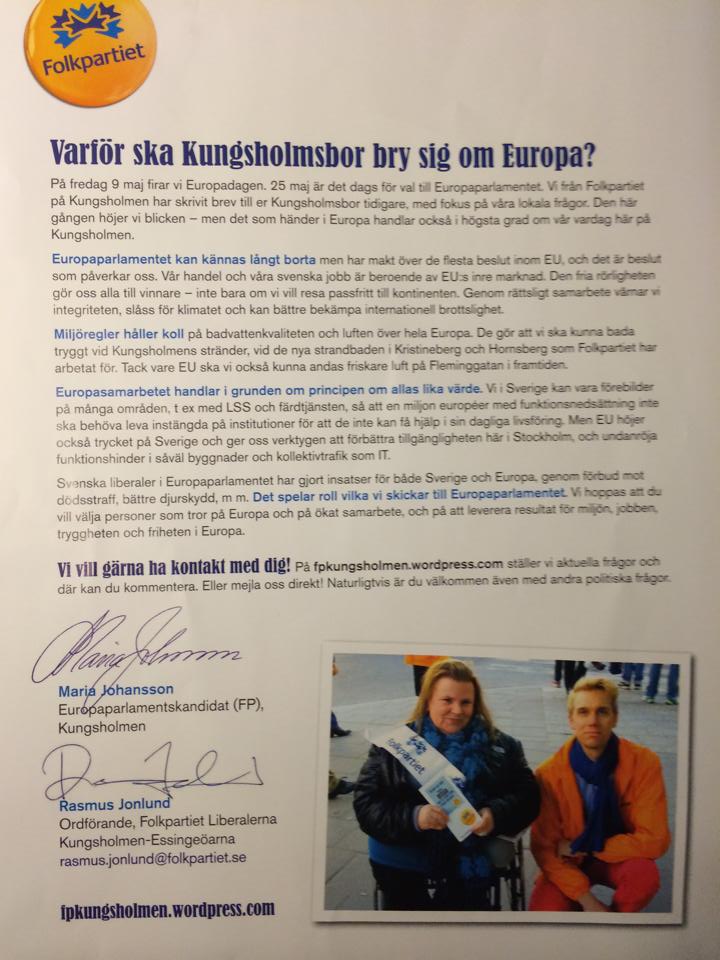 Svenska liberaler i Europaparlamentet har gjort insatser för både Sverige och Europa, genom förbud mot dödsstraff, bättre djurskydd m m. Det spelar roll vilka vi skickar till Europaparlamentet. Vi hoppas att du vill välja personer som tror på Europa och på ökat samarbete, och på att leverera resultat för miljön, jobben, tryggheten och friheten i Europa.